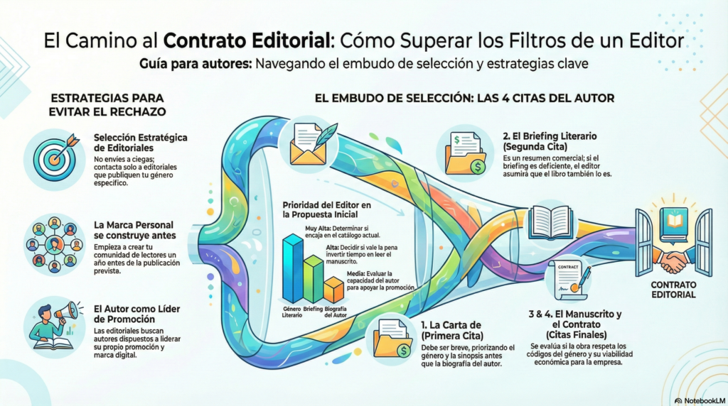 Cuando llegas a la tercera cita, el editor evalúa calidad literaria, sí. Pero también evalúa si dominas el género.